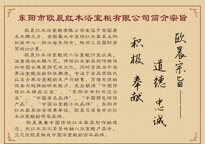 歐晨進入浴室柜行業以來,注重吸收木雕工藝、傳統紅木家具制作精華和中國古典裝飾藝術文化基因,同時緊跟當今世界浴室柜業的科技潮流,匠心制造高品質中國傳統古典中式、新中式、歐式、美式浴室柜的設計生產與銷售,憑借專業的超強研發能力。